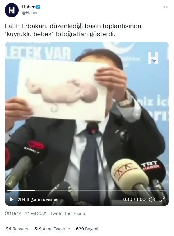 Yeniden Refah Partisi Genel Başkanı Fatih Erbakan, basın toplantısında kuyruklu, üç kollu, tek gözlü ve bütün vücudu tüylerle kaplı bebeklerin fotoğraflarını göstererek mRNA aşılarının bu duruma sebep olduğunu iddia etti. Erbakan, konuşmasında mRNA aşılarının insan DNA’sını değiştirdiğini insan genomundaki değişikliklerin bu tip bebekler doğmasına neden olduğunu öne sürdü.