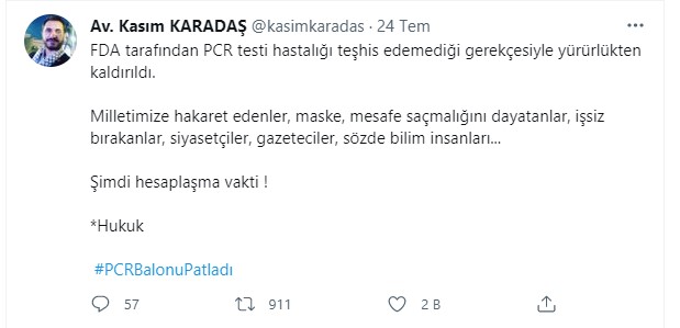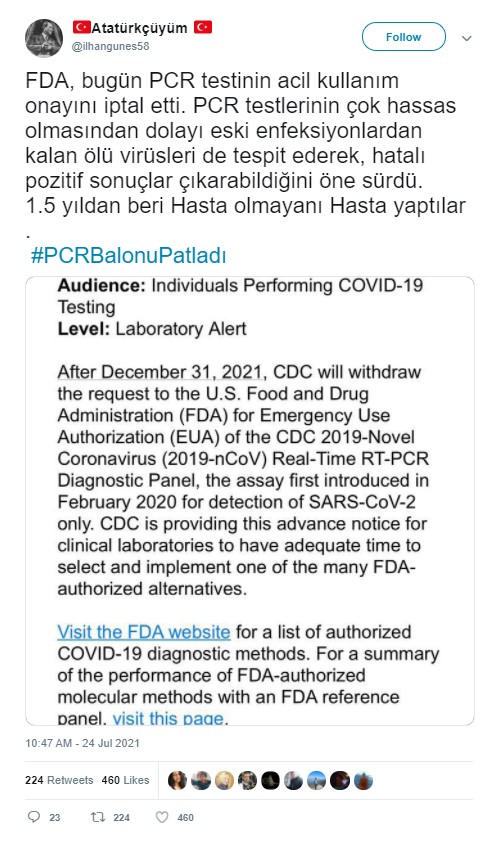 Twitter kullanıcıları ve haber sitelerinin iddiasına göre ABD İlaç ve Gıda Kurumu (FDA) PCR testinin kullanımı işe yaramadığı için kaldırdı. İddia Twitter’da #PCRBalonuPatladı tagı altında gündem oldu.