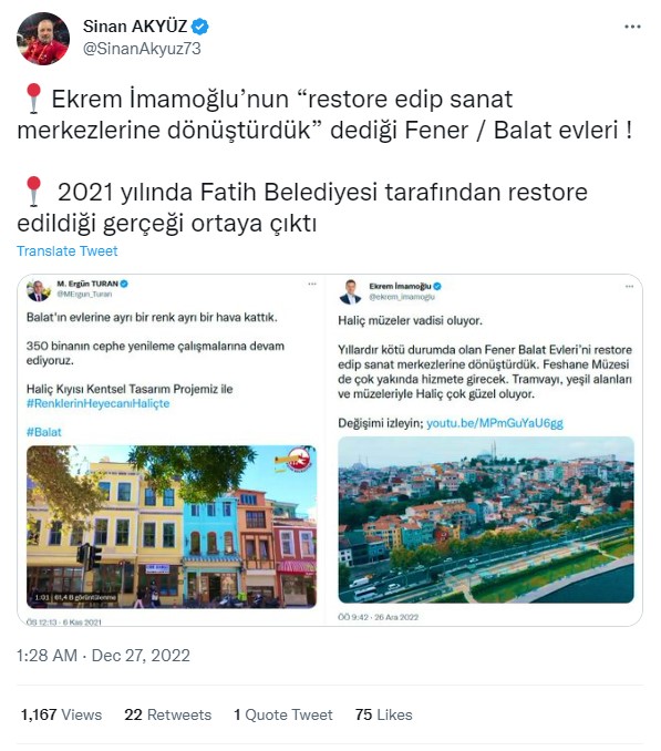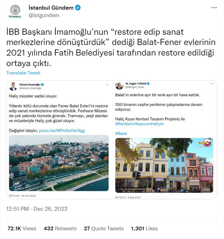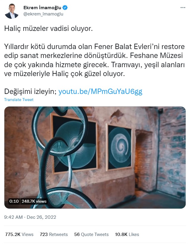 İstanbul Büyükşehir Belediye Başkanı Ekrem İmamoğlu ise, paylaşımında Fener Balat Evleri’ni restore ederek sanat merkezlerine dönüştürdüklerinden bahsediyor. Paylaşıma eklediği videoda ‘Haliç Sanat’ ismiyle tanıtılan mekanların restorasyon aşamaları ve yeni halleri gösteriliyor.