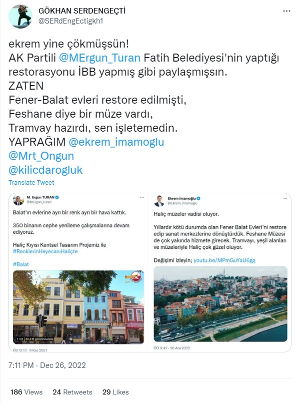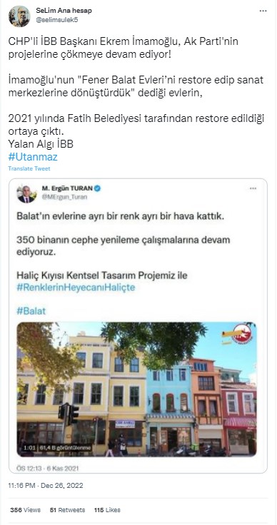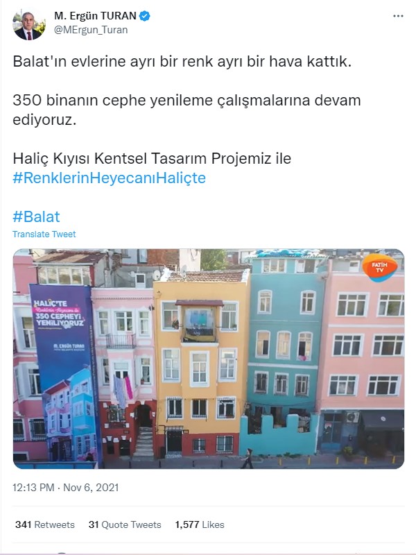 Öncelikle iddiada atıf yapılan Twitter paylaşımlarına bakmakta fayda var. Fatih Belediye Başkanı Ergün Turan 6 Kasım 2021’de yaptığı paylaşımda Balat’ta yer alan 350 binada cephe yenileme çalışmalarına devam edildiğini ifade ediyor. Paylaşımına, Haliç Kıyısı Kentsel Tasarım Projesi ismiyle tanıttığı çalışmanın bir de videosunu eklemiş.
