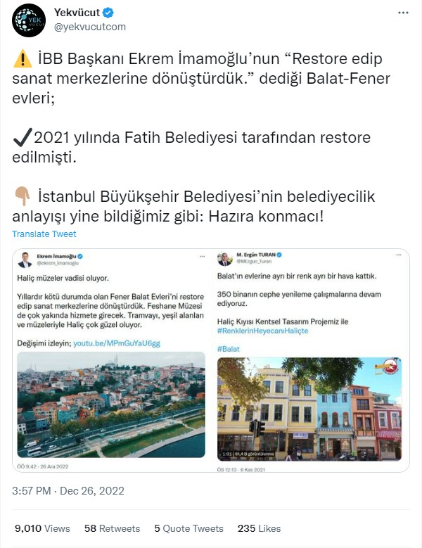 - Dolayısıyla, Haliç Sanat adıyla açılan Fener Evleri’nin daha önce Fatih Belediyesi tarafından restore edildiği iddiası doğru değil.