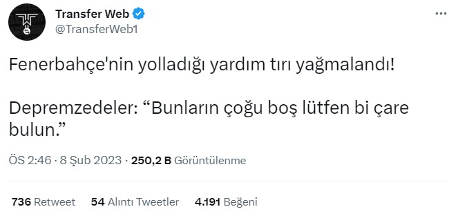 "Stadyumdan yola çıkarak deprem bölgesine gönderdiğimiz tırların yağmalandığına yönelik iddialar hiçbir şekilde gerçeği yansıtmıyor." pic.twitter.com/3HDsS53BtQ