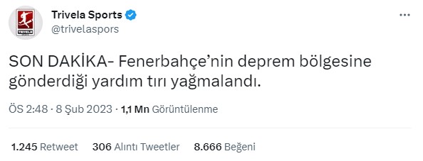 Fenerbahçe Spor Kulübü resmi Twitter hesabına bakıldığında afet bölgesine yapılan yardım kampanyasıyla ilgili birçok paylaşımda bulunduğu ve güncel olarak yardım tırlarının yüklemelerinin yapıldığı belirtiliyor, ancak ortaya atılan iddialarla ilgili bir paylaşımın söz konusu olmadığı görülüyor.