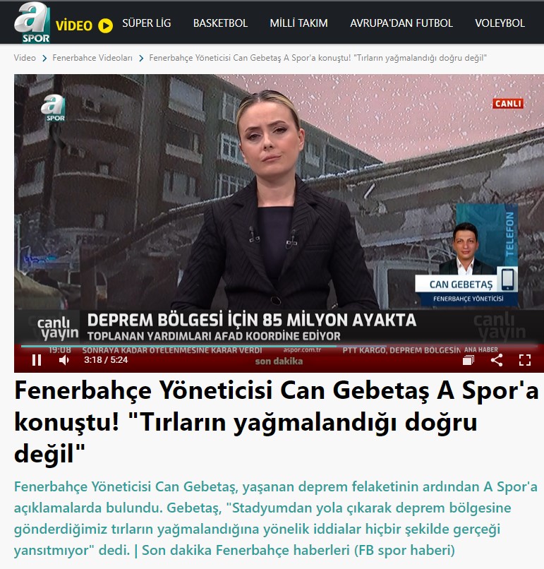 Fenerbahçe Spor Kulübü Yöneticisi Can Gebetaş, katıldığı yayında deprem bölgesine yapılan yardım çalışmalarına ilişkin açıklamalarda bulunmuş. Gebetaş, bu açıklamalarında tırların yağmalandığına dair iddiaların gerçeği yansıtmadığını ve gerçekle alakası olmayan bir durum olduğunu ifade etmiş.