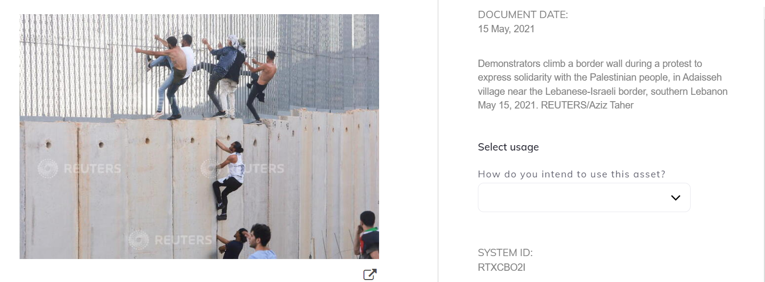 Ayrıca anahtar kelimelerle araştırma yaptığımızda da Reuters’ın fotoğraflarına ulaşıyoruz. Fotoğraflarda protestolar sırasında duvara tırmanan insanlar görülüyor. 15 Mayıs 2021 tarihli fotoğrafların notunda ise, “Göstericiler, güney Lübnan’ın Lübnan-İsrail sınırı yakınındaki Adaisseh köyünde Filistin halkıyla dayanışmayı ifade etmek amacıyla düzenlenen bir protesto sırasında sınır duvarına tırmanıyor” ifadesi yer alıyor. Bu fotoğrafların da olaylarla bir bağlantısı olduğu anlaşılıyor.