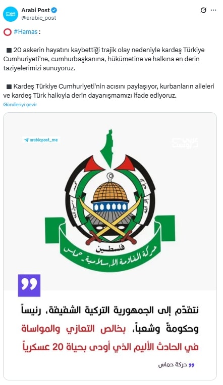 Sonuç olarak son zamanlarda yayılan iddianın aksine Filistin, 20 şehidimiz ardından taziye mesajı ileten ülkeler arasında yer alıyor.