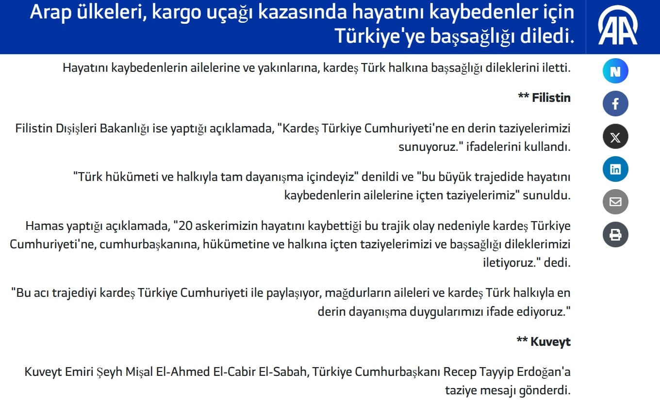 Anahtar kelime taraması ile araştırmamıza başladık. Karşımıza Anadolu Ajansı’nın Arapça yayını çıktı. “Arap ülkeleri, kargo uçağı kazasında hayatını kaybedenler için Türkiye’ye başsağlığı diledi” başlıklı haberde Filistin’in taziye mesajına yer verilmiş.