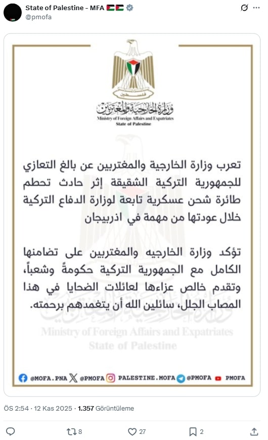 Filistin Dışişleri ve Gurbetçiler Bakanlığı, Azerbaycan’daki görevinden dönerken bir Türk Savunma Bakanlığına bağlı askeri nakliye uçağının düşmesi sonucu hayatını kaybeden Türkiye Cumhuriyeti vatandaşları için en derin taziyelerini sunar.