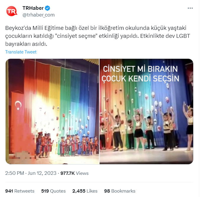 Sosyal medyada bazı görüntüler paylaşılarak bir anaokulunda ‘cinsiyet seçme partisinin’ düzenlendiği iddiası yayıldı. Görüntülerde yer alan sahne dekoru, LGBT+ bayrağı ile ilişkilendirilerek çocukların cinsiyetlerini seçtikleri bir etkinlik düzenlendiği iddia edildi.