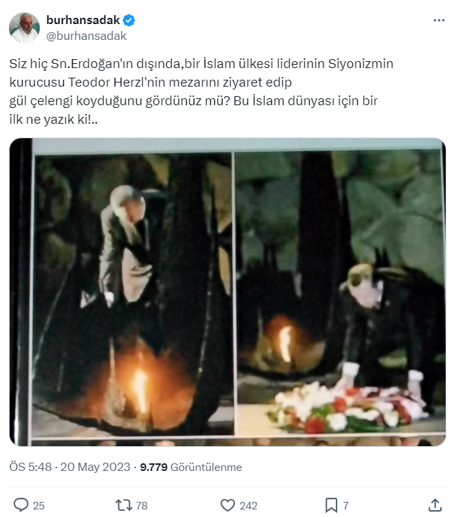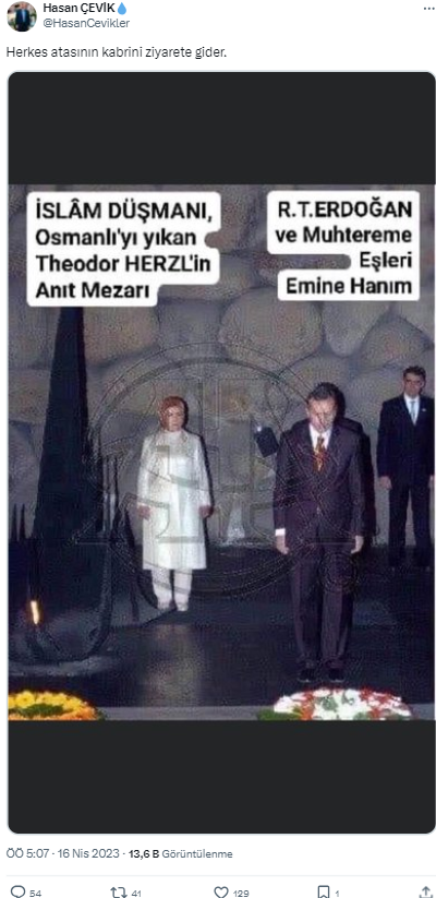 - Erdoğan’ın Theodor Herzl’in mezarını ziyaret ederken çekilmiş bir fotoğrafı veya konuya ilişkin herhangi bir haber bulunmuyor.