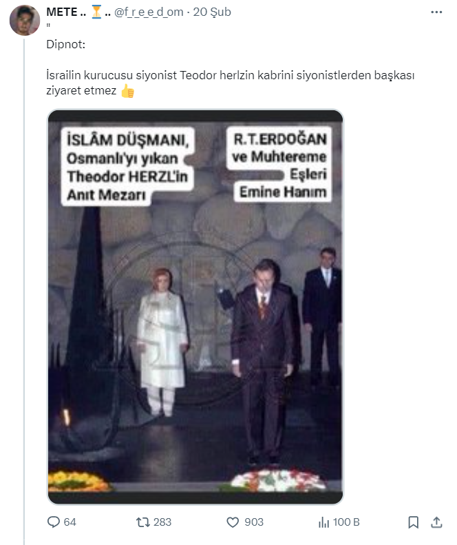 Sosyal medyada farklı zamanlarda ve neredeyse 10 yıldır dolaşımda olan bir görüntü yeniden gündeme geldi. İddiaya göre fotoğraf, Cumhurbaşkanı Recep Tayyip Erdoğan ve eşi Emine Erdoğan’ın Siyonizmin kurucusu olarak bilinen Theodor Herzl’in anıt mezarını ziyaretinde çekilmiş.