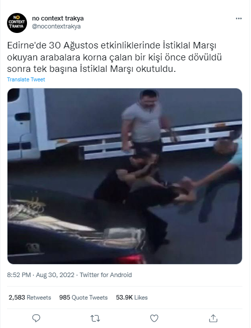 30 Ağustos Zafer Bayramı günü,@nocontextrakya tarafından yapılan bir paylaşım 54.000’nin üstünde etkileşim aldı. Bulanık bir görselin olduğu paylaşımda Edirne’de 30 Ağustos etkinliklerinde İstiklal Marşı okuyan arabalara korna çalan bir kişinin önce dövülüp sonra tek başına İstiklal Marşı’nın okutulduğu iddiası yer alıyor.