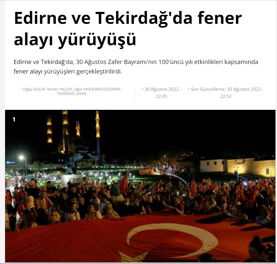 İçerik olarak Google araması yaptığımızda, haber sitelerinde 30 Ağustos Zafer Bayramı’nda Edirne’de 100’üncü yıl kapsamında fener alayı etkinlikleri yapıldığı görüyoruz. Edirne’de bir tesiste valilik tarafından resepsiyon verildikten sonra Edirne Belediye Başkanlığı tarafından fener alayı yürüyüşünün gerçekleştirildiğini, bu yürüyüşte İstiklal Marşı’nın okunduğu bilgisi veriliyor. İstiklal Marşına saygısızlık niteliğinde bir davranışta bulunan ya da şiddet uygulanılarak zorla İstiklal Marşı okutulan bir şahsa dair haber bulunmuyor.