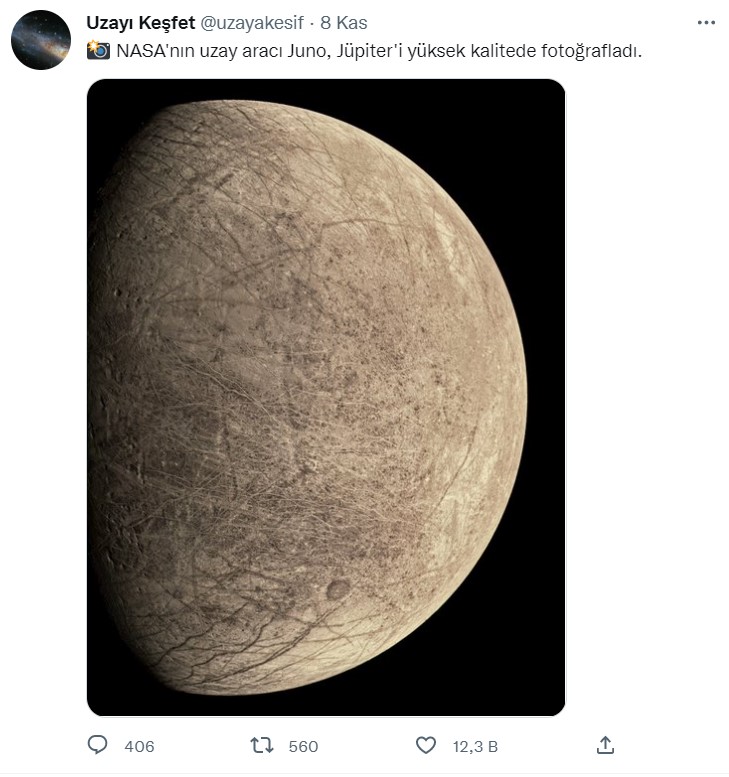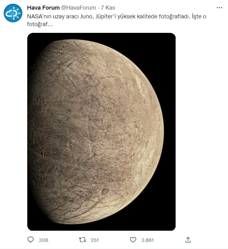 Ardından araştırmamıza Twitter’dan devam ediyoruz. Yabancı kullanıcılar tarafından paylaşılan bu görselin Jüpiter değil, uydusu Europa olduğu belirtilmiş.