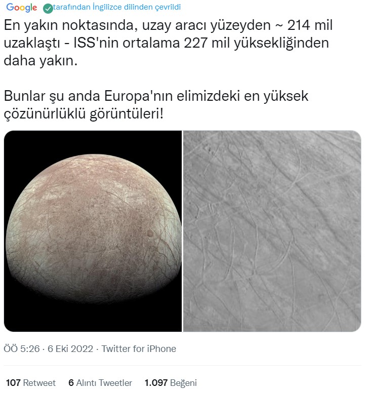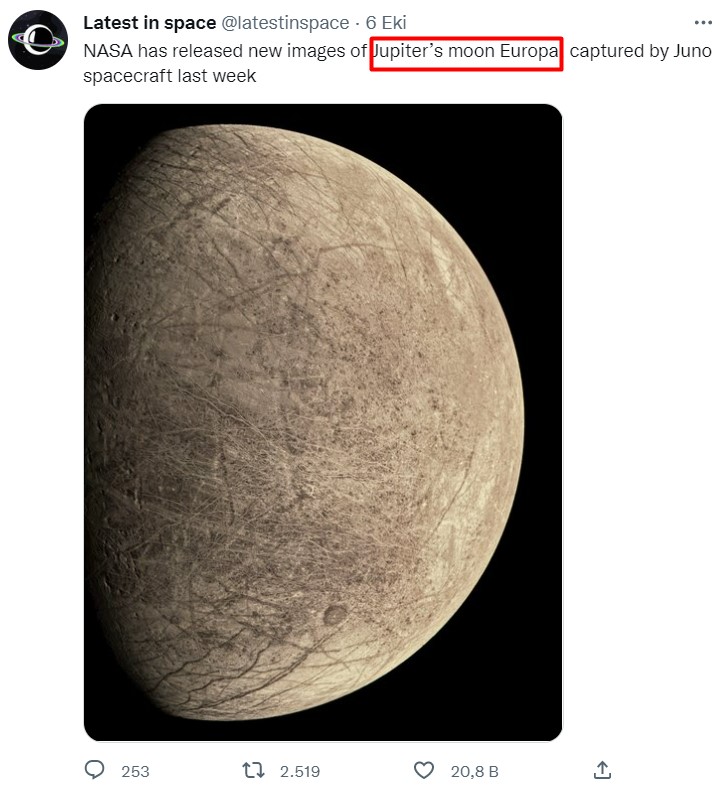 Latest in Space isimli Twitter hesabındaki bu fotoğrafın, Europa’nın bilinen en net görüntüsü olduğu açıklaması yer alıyor. Bu nedenle söz konusu görselin hatalı aktarıldığı ve yanlış bilginin yayılmasına neden olduğu söylenebilir.