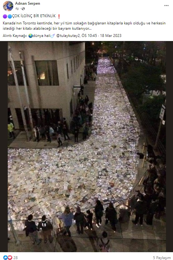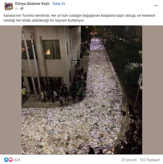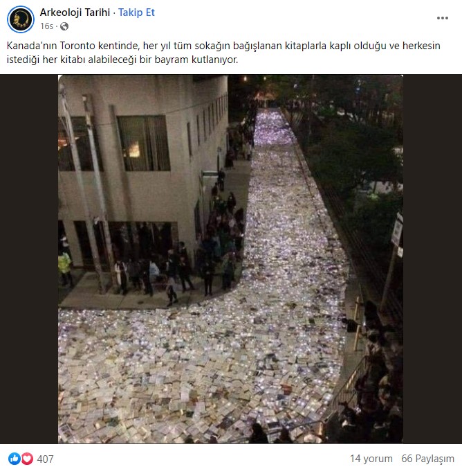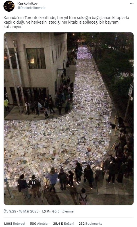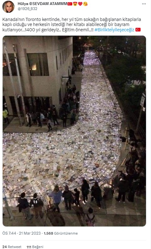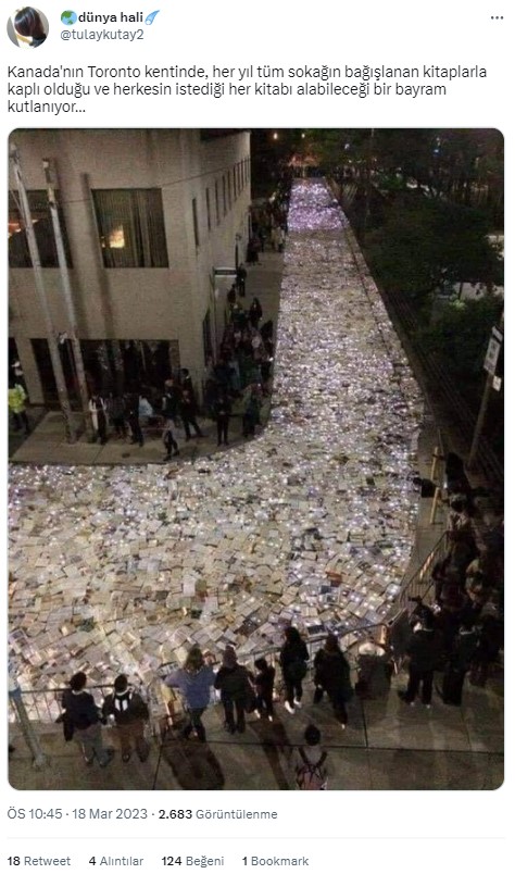 Sosyal medyada paylaşılan ve kısa süre içerisinde etkileşim alan bir fotoğrafın, Kanada’nın Toronto kentinde her yıl kutlanan kitap bayramından olduğu ve sokakların bağışlanan kitaplarla dolu olduğu, herkesin istediği kitabı alabildiğini gösterdiği öne sürüldü.