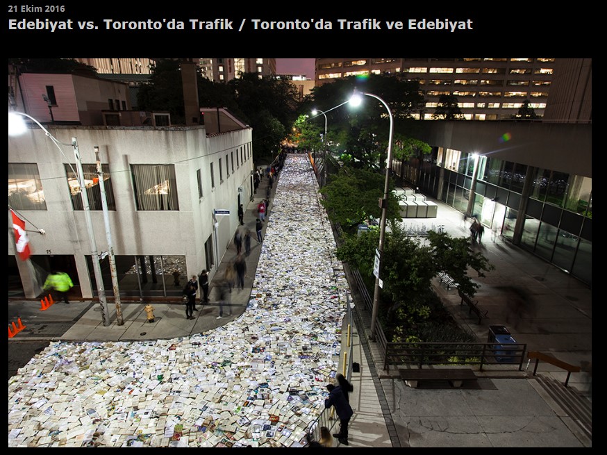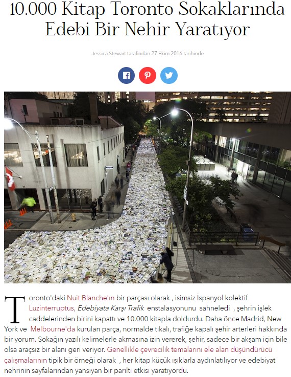 - Paylaşım güncel değil, Ekim 2016 yılında Luzinterruptus isimli sanatçı grubu tarafından hazırlanan “Edebiyata Karşı Trafik” isimli çalışmadan.