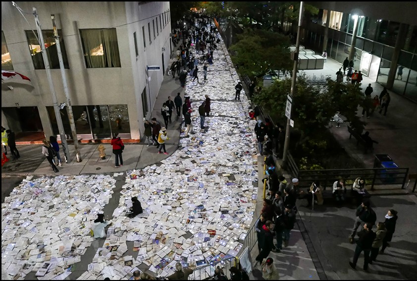Fotoğraf gerçekten de 2016’da Toronto’da çekilmiş, ancak sosyal medyada iddia edildiği gibi sokakların her yıl bağışlanan kitaplarla dolu olduğuna yönelik iddialar gerçeği yansıtmıyor.