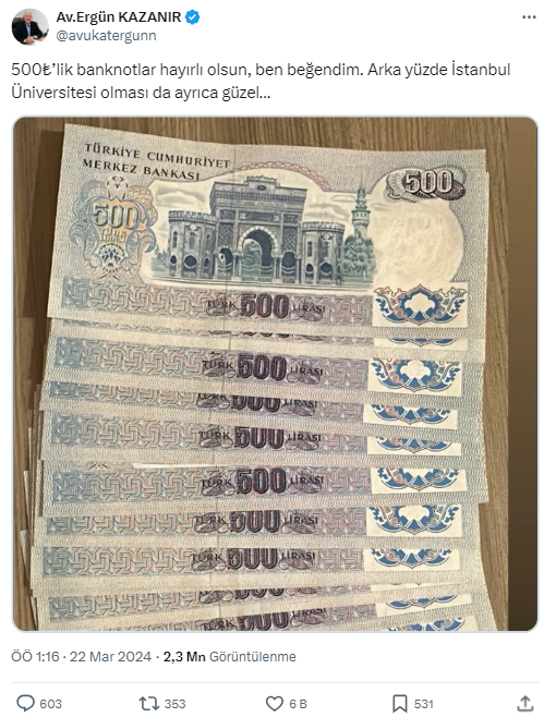 Sosyal medyada gündeme gelen ve kısa süre içerisinde yüksek etkileşim alan bir X paylaşımı ile bu sefer de 500 TL’lik banknotların basıldığı iddia edildi. Hem mizah konusu olan hem de kimi kullanıcıda ‘tedavüle yeni giren banknot’ algısı oluşturan bu iddianın doğruluğunu araştırdık.