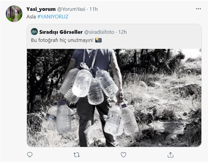 Paylaşımın ardından oldukça etkileşim alan tweet, pek çok kullanıcı tarafından, fotoğraftaki kişinin yangını söndürmeye gittiği şeklinde algılandığı görüldü.