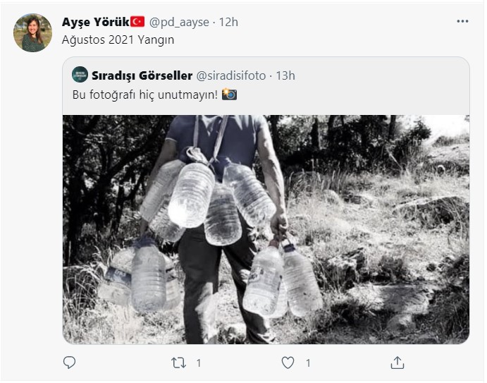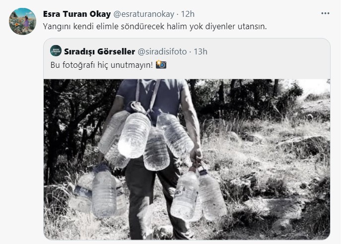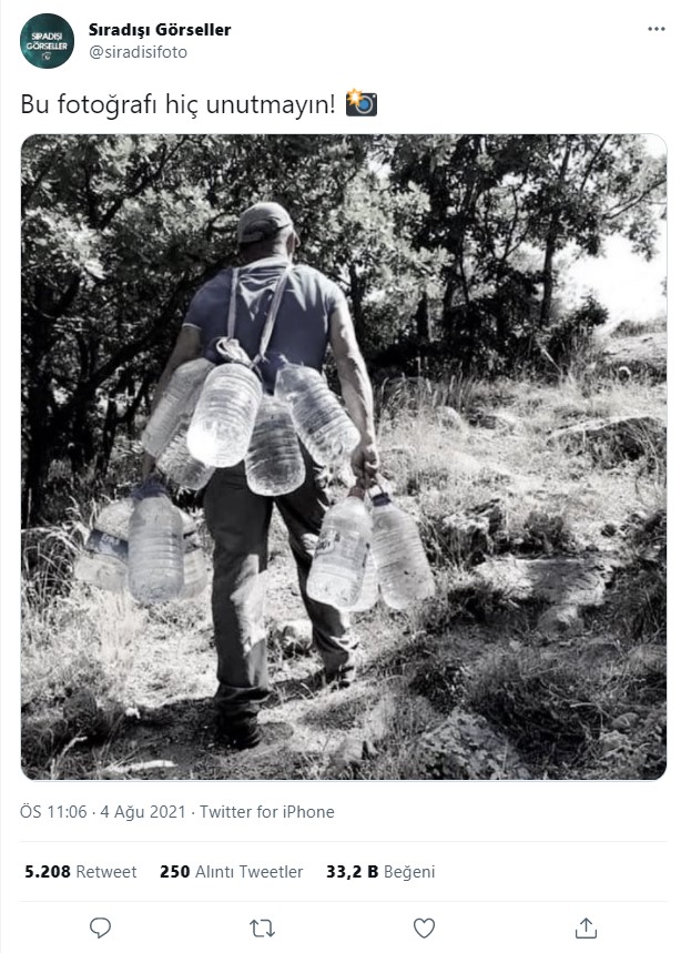 Günlerdir ülkemizde yaşanmakta olan yangınlara ilişkin sosyal medya platformlarında çok sayıda görsel paylaşılıyor. Ancak bazı görseller, farklı zaman ve durumlarda çekilmiş olmasına karşın birtakım sosyal medya hesaplarınca mevcut yangınlara ilişkin güncel görsellermiş gibi servis ediliyor. Bunlardan biri de, elinde tek seferde birçok su bidonu taşıdığı görülen bu kişinin fotoğrafı. Bir sosyal medya kullanıcısı tarafından “Bu fotoğrafı hiç unutmayın” ifadesiyle paylaşıldı.