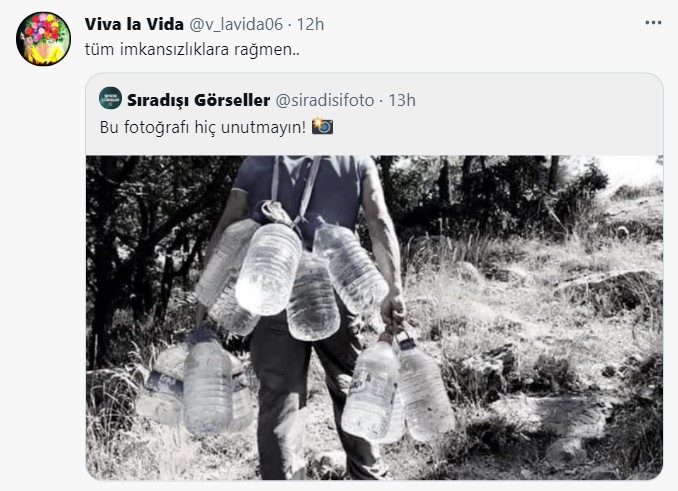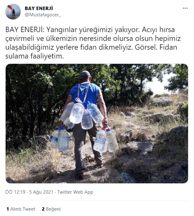 Sosyal medyada, çok sayıda bidonu tek seferde taşıdığı görülen kişinin bu suları yangını söndürme amaçlı kullanacağı iddia edildi. Ancak, yapılan sorgulamada fotoğrafın geçmiş yıllardaki bir fidan sulama etkinliğinden olduğu anlaşılıyor.