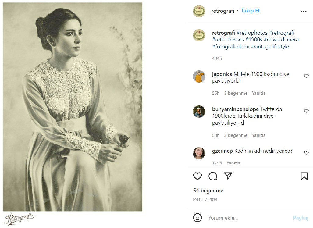 “Bir Türk kadını 1900” notuyla paylaşılan bu fotoğrafı Yandex Images üzerinden tersine görsel arama yöntemi kullanarak taradığımızda Twitter’da bir kullanıcının tweetine ulaştık. Tweete cevap olarak hemen altta bir kullanıcı bu fotoğrafın retro çekim olduğunu belirtip, Retrografi’nin web sitesine yönlendirmiş.