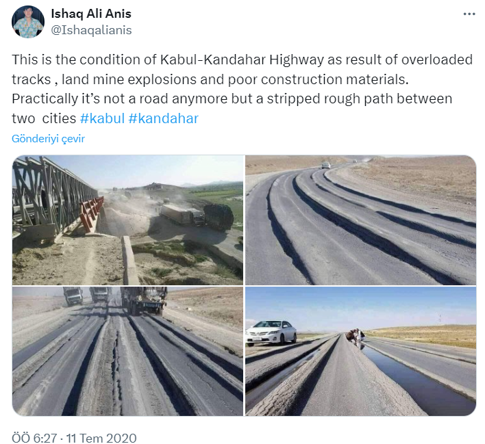 Ayrıca içerik üreticisi Ishaq Ali Anis, 11 Temmuz 2020 yılında X hesabı üzerinden yaptığı paylaşımda Kabil-Kandahar Karayolu’nun mayın patlamaları ve kötü inşaat malzemeleri gibi nedenler yüzünden bu halde olduğunu söylemiş. Anis’in paylaşımına eklediği görselleri incelediğimizde de yolun aynı olduğunu söyleyebiliyoruz.