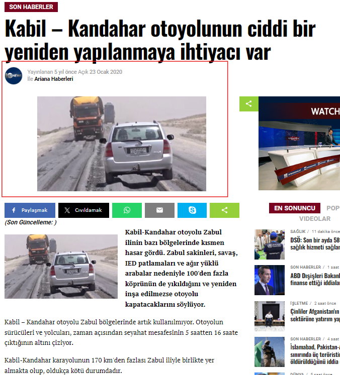 Ulaştığımız bir diğer kaynak ise Ariana Haber kuruluşunun 23 Ocak 2020 tarihli haberi oluyor. Bu haberde de benzer görüntülerin kullanıldığı ve Kabil – Kandahar karayolunun onarılması gerektiği vurgulanmış. Ayrıca kötü bir durumda olan yolun onarımı yapılmazsa trafiğe kapatmak zorunda kalınabileceği de belirtilmiş.