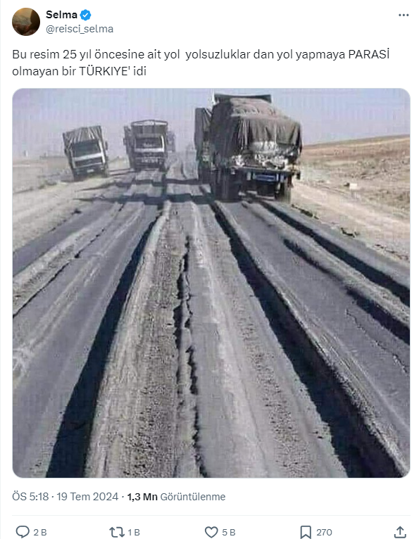 Sosyal medyada paylaşılan bozuk bir karayolu fotoğrafının, Türkiye’nin 25 yıl önceki yollarını gösterdiği iddia edildi.