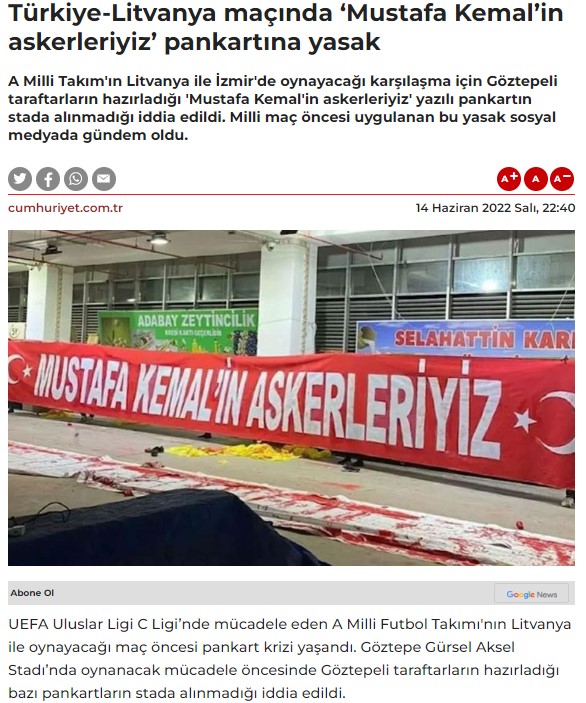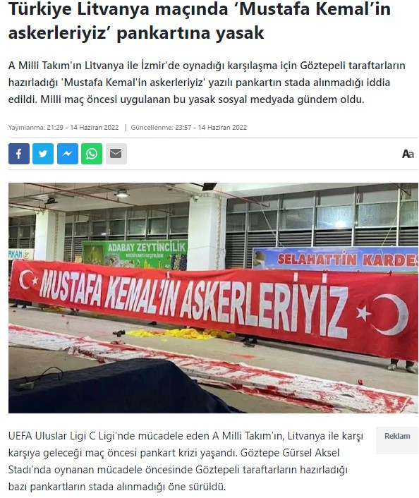 İddialara sebebiyet veren fotoğrafa yönelik tersine görsel arama yaptığımızda, “Mustafa Kemal’in Askerleriyiz” yazılı pankartın İzmir’de oynanan Türkiye-Litvanya milli maçında açılmak üzere hazırlandığı sonucuyla karşılaşıyoruz. Pankartın, A Milli Takım’ın Litvanya’ya karşı 14 Haziran 2022’de İzmir Göztepe Gürsel Aksel Stadı’nda oynanan karşılaşma öncesinde içeri alınmadığına dair birçok haber basına yansımış, olaya ilişkin sosyal medya kullanıcıları da tepkisini dile getirmiş.