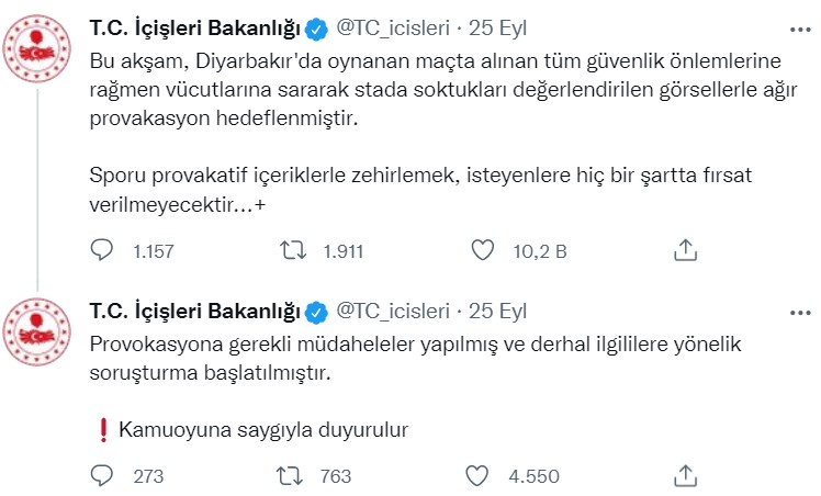 Konuya ilişkin İçişleri Bakanlığı 25 Eylül’de yaptığı açıklamada, güvenlik önlemlerine rağmen yapılan provokasyona ilişkin gerekli müdahalenin yapıldığını ve soruşturma başlatıldığını duyurdu. Diyarbakır Valiliği tarafından da yasal işlem başlatıldığı bilgisi kamuoyuyla paylaşıldı.