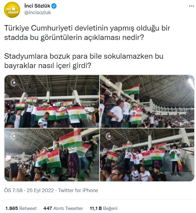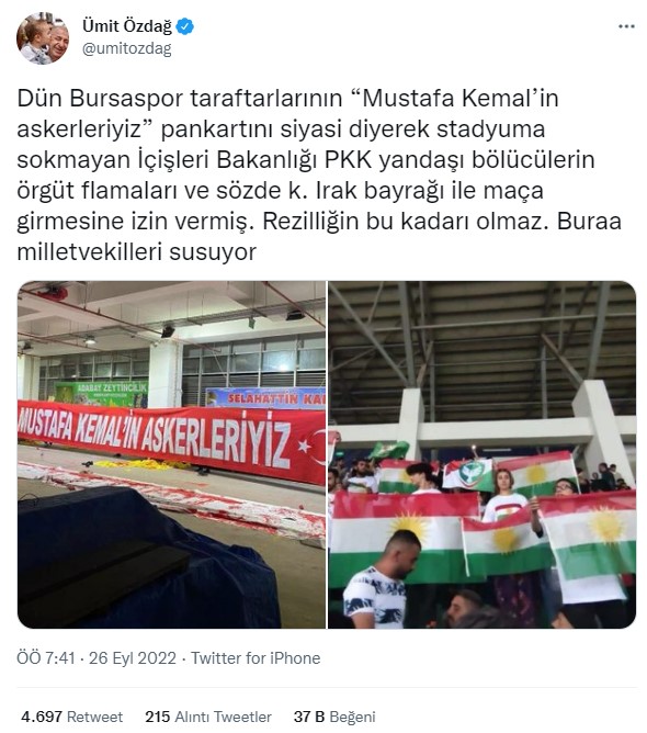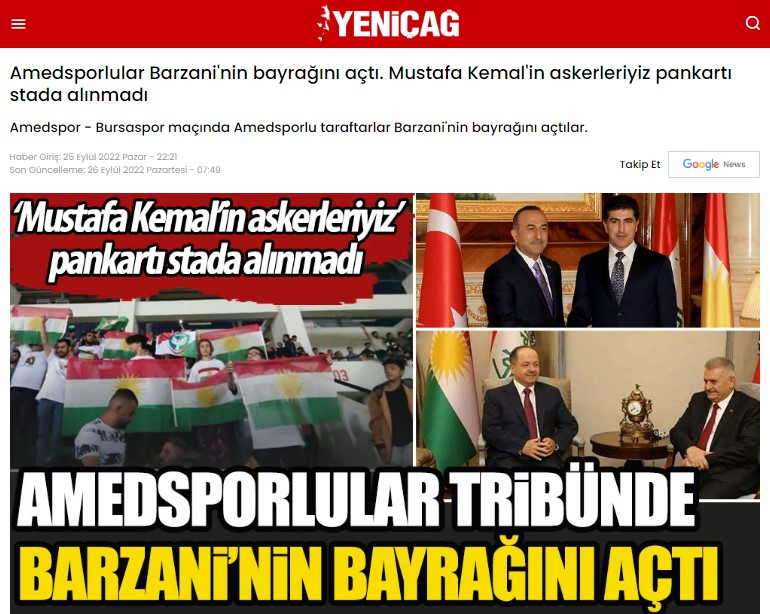 25 Eylül 2022’de Amedspor-Bursaspor karşılaşmasında, bir grubun Irak Kürt Bölgesel Yönetimi bayrağını açtığı görüntüler sosyal medyada tepkiyle karşılanmıştı.