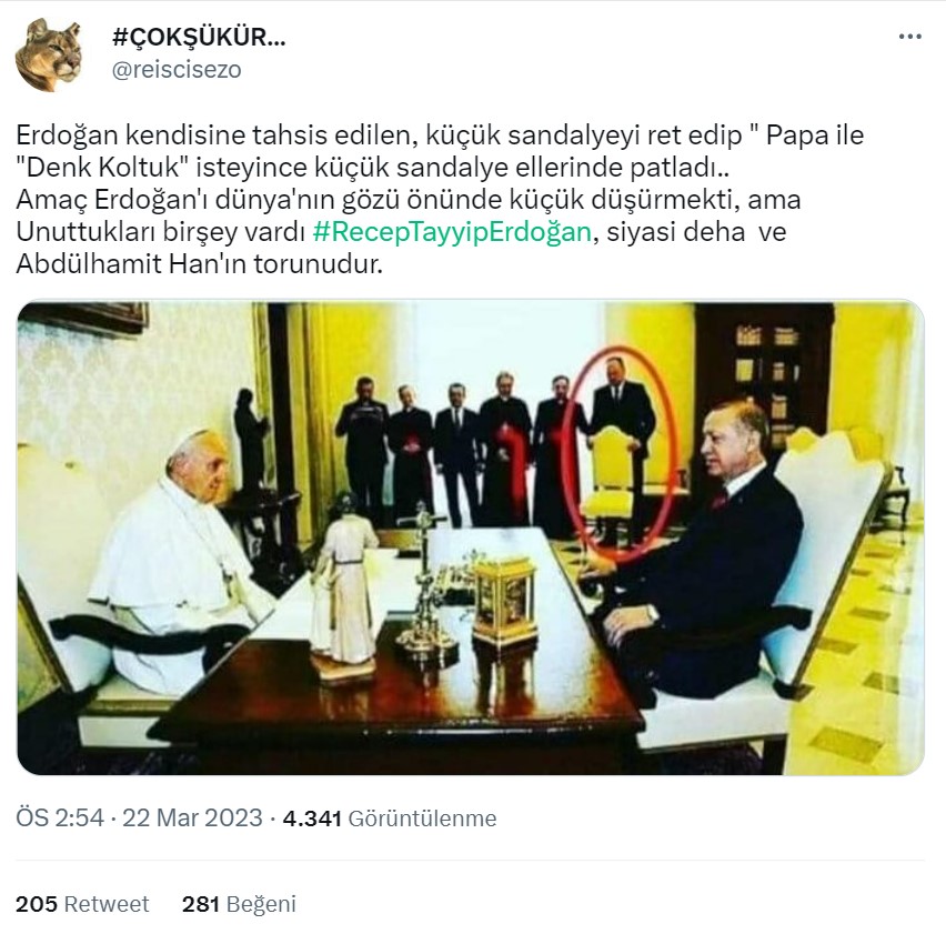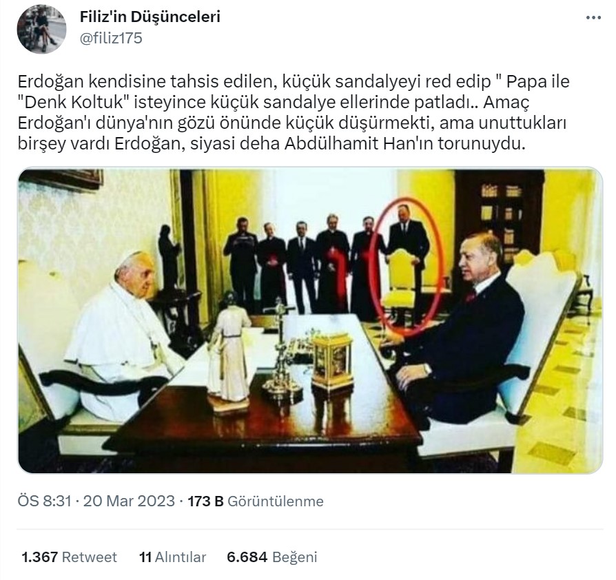 Fotoğrafın Cumhurbaşkanı Erdoğan ile Papa görüşmesindeki sandalye değişikliğini gösterdiği iddiası