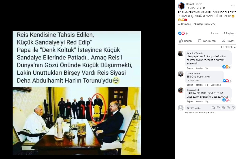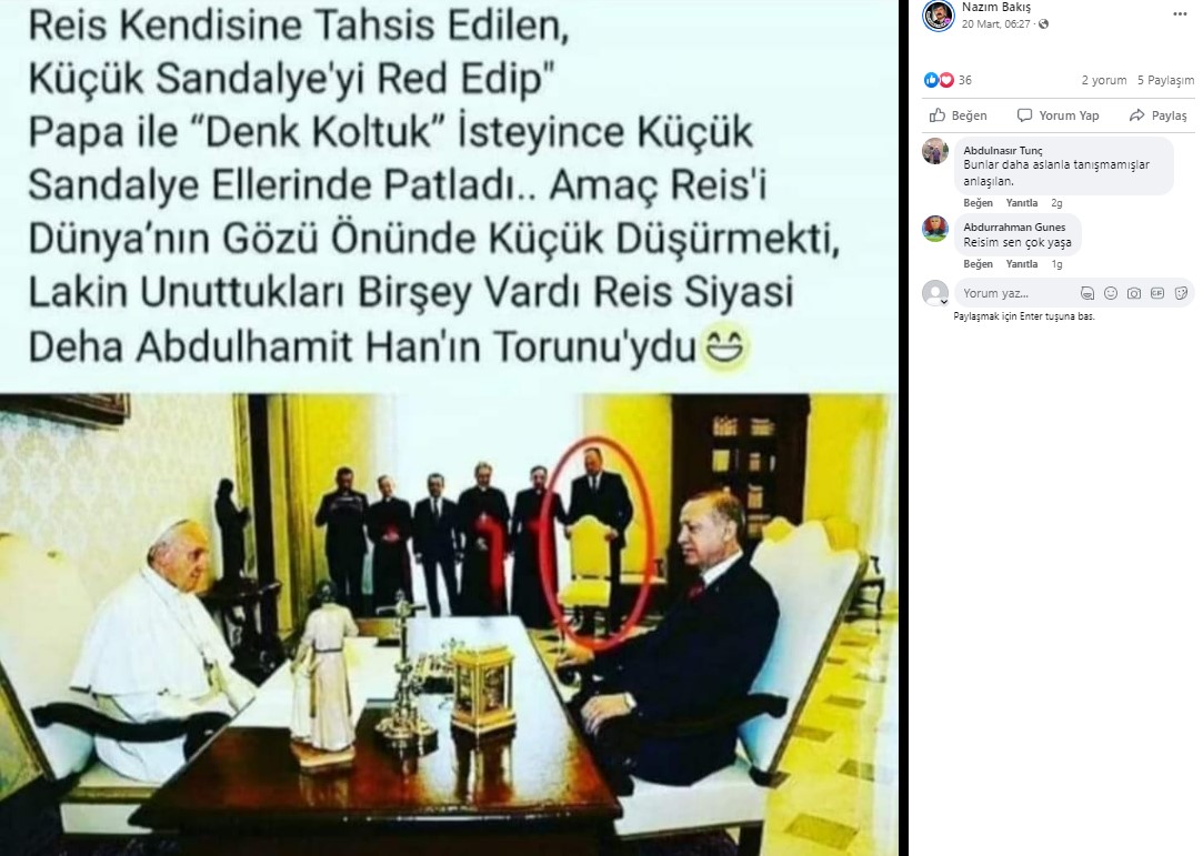 Sosyal medyada Papa ve Erdoğan’ın 2018 yılındaki görüşmesine ait bir fotoğraf paylaşılıyor ve Erdoğan’ın Papa ile denk sandalye istemesi üzerine değişiklik yapıldığı iddia ediliyor. Bu iddianın doğruluğunu inceledik.