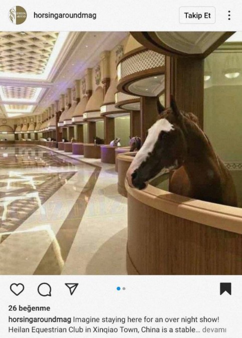 Gösterişli dizaynı nedeniyle Dubai’de bulunduğu şeklinde yanlış bir kanının hakim olduğunu belirten yazıda, buranın Çin’in Jiangsu kentindeki Heilan Binicilik Kulübü olduğu belirtilmiş. Fotoğraf, kulübün içerisindeki At Kültür Müzesi’ne aitmiş.