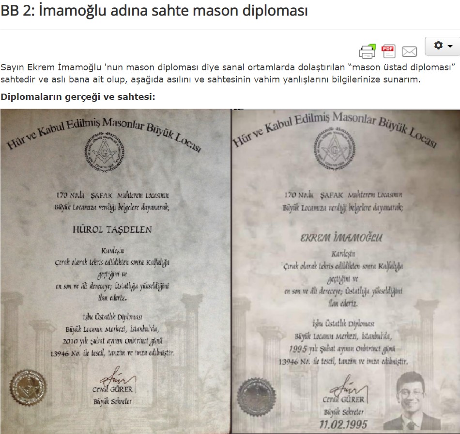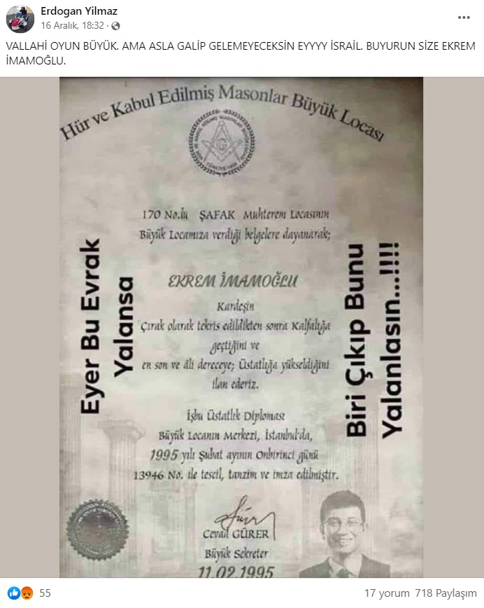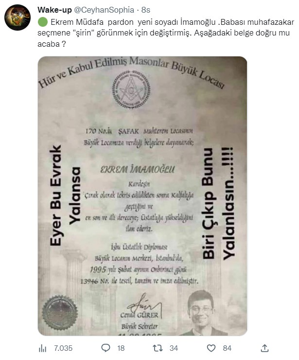 - Ekrem İmamoğlu’na ait olduğu sanılan Mason belgesi fotomontaj ile oluşturulmuş.
