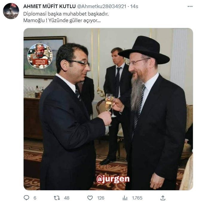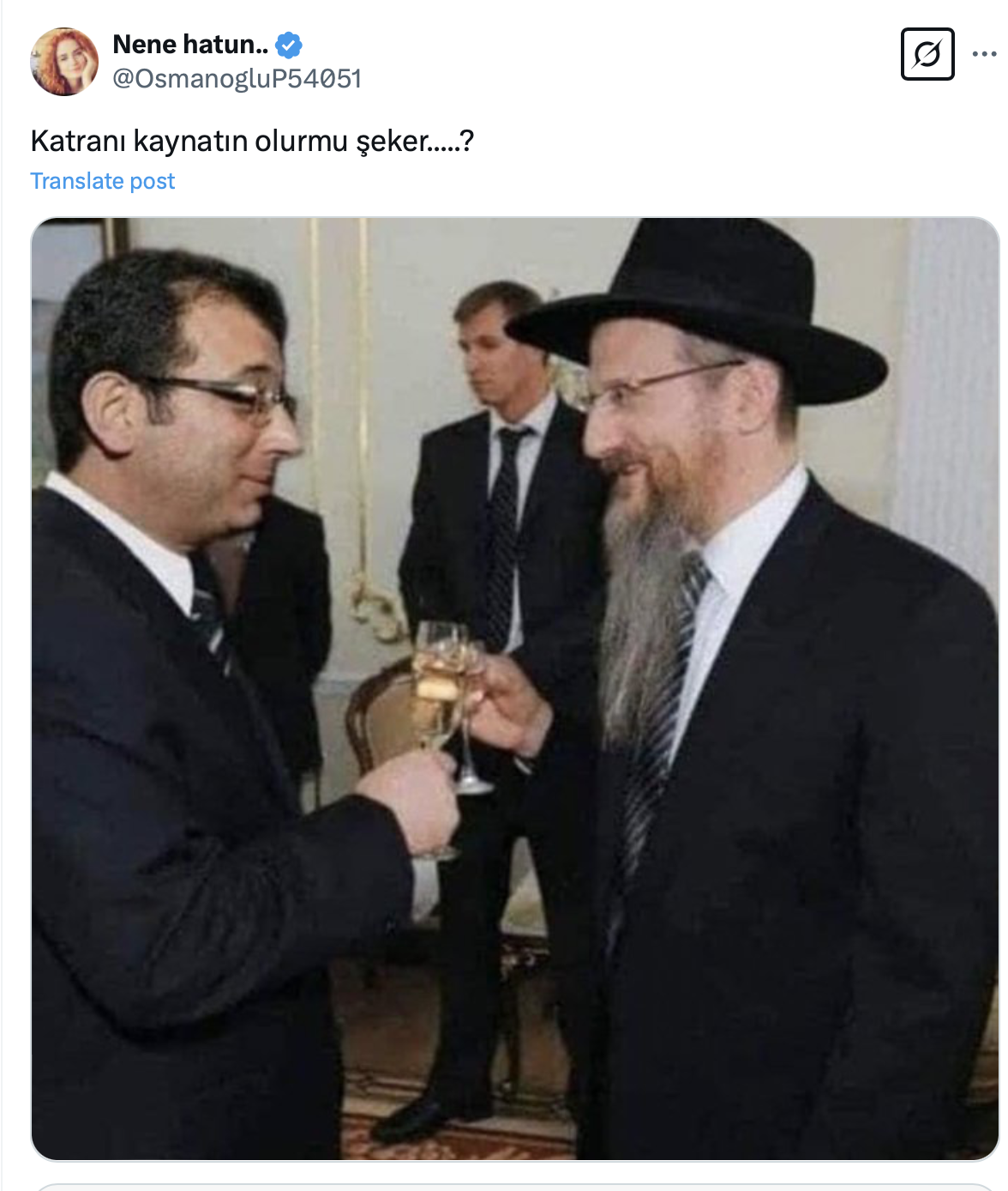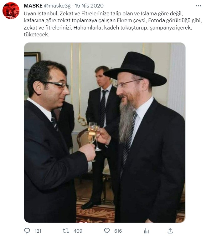 Twitter’da İstanbul Büyükşehir Belediye Başkanı Ekrem İmamoğlu’na ait olduğu iddiasıyla yayılımda olan bir görsel, oldukça fazla etkileşim aldı. İddia sahipleri söz konusu fotoğrafın, İmamoğlu’nun bir kişiyle kadeh tokuşturduğu anı gösterdiğini belirtiyor. Fotoğrafın internetteki diğer yayılımlarını incelediğimizde, İmamoğlu’nun karşısındaki kişinin haham olduğunu iddia edenler de bulunuyor. Bu görüntünün gerçek olup olmadığını inceledik.