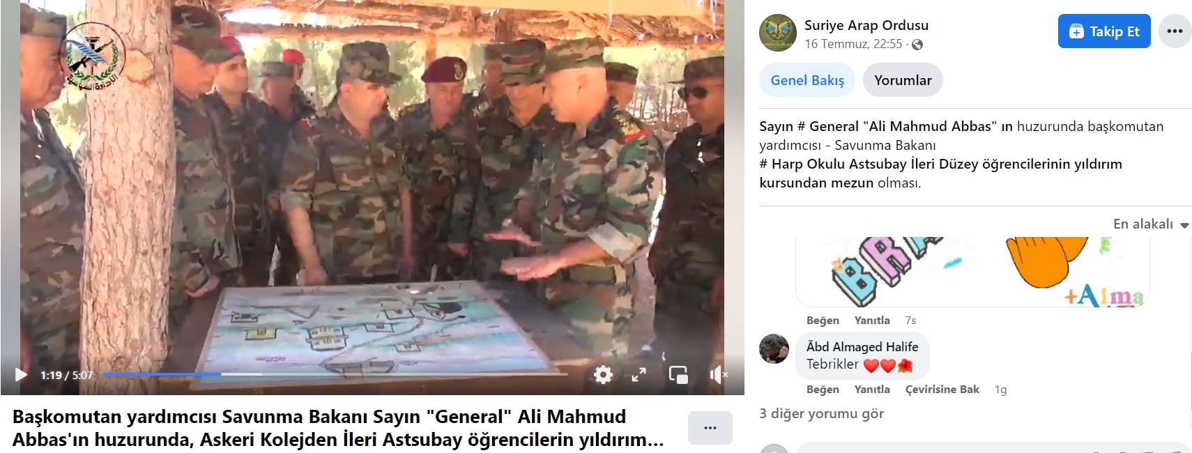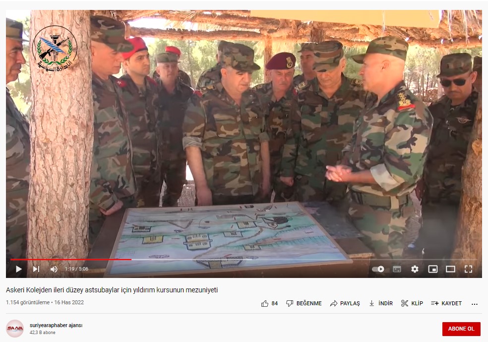 Görüntü, Suriye Arap Ordusu isimli Facebook hesabından “Harp Okulu Astsubay İleri Düzey öğrencilerinin yıldırım kursundan mezun olması” açıklaması ile paylaşılan bir videodan alınmış.