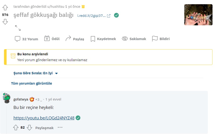 Bu sefer tersine görsel arama yöntemi kullanarak ilgili fotoğrafı TinEye üzerinden aradığımızda, geçtiğimiz yıl Reddit’te bir kullanıcı tarafından ‘Transparent Rainbow Fish’ (şeffaf gökkuşağı balığı) açıklamasıyla paylaşıldığı sonucuna ulaşıyoruz. Altta yer alan yorumlarda ise bir kullanıcı görseldeki balığın gerçek olmadığını belirterek bir YouTube linki paylaşmış.