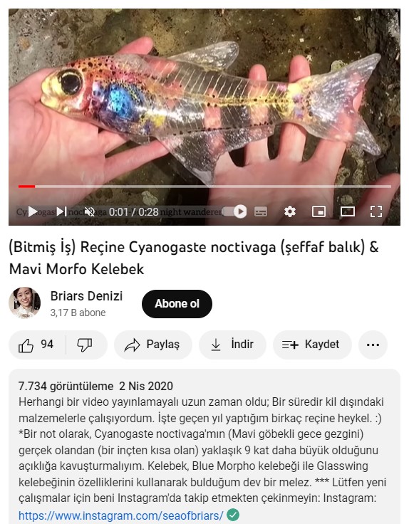 İlgili videoda bir kişinin iki eliyle tuttuğu balığın aslında reçineden yapılan bir balık heykeli olduğunu görüyoruz. Video sahibi “Seaofbrizars” isimli kullanıcı, bu balığın bilimsel ismiyle “Cyanogaste Noctivaga” olduğunu ve temsili olarak bir heykelini yaptığını belirtmiş.