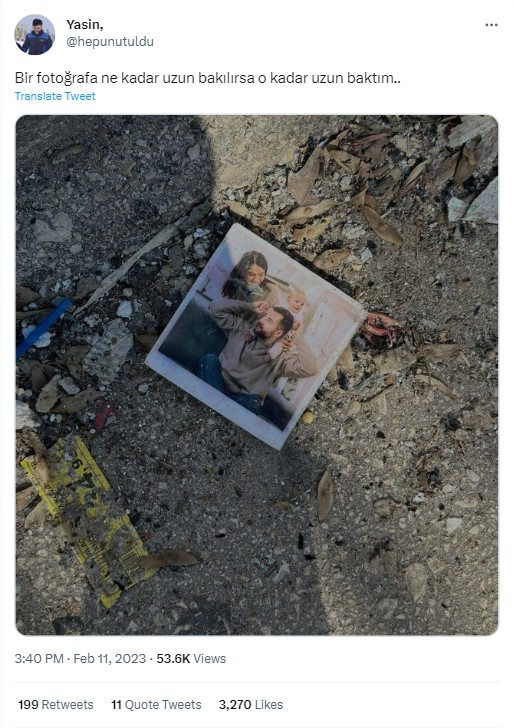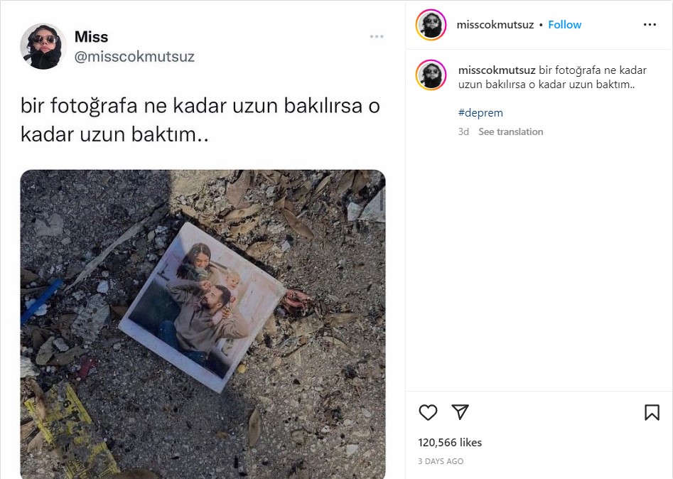 Geçtiğimiz günlerde sosyal medyada, enkazdan çıktığı ima edilen bir fotoğraf paylaşıldı. İddiaya kaynak olarak anne, baba ve çocuğu gösteren fotoğrafın enkaz bölgesinde yerde kaydedilmiş bir görüntüsü kullanılmış.