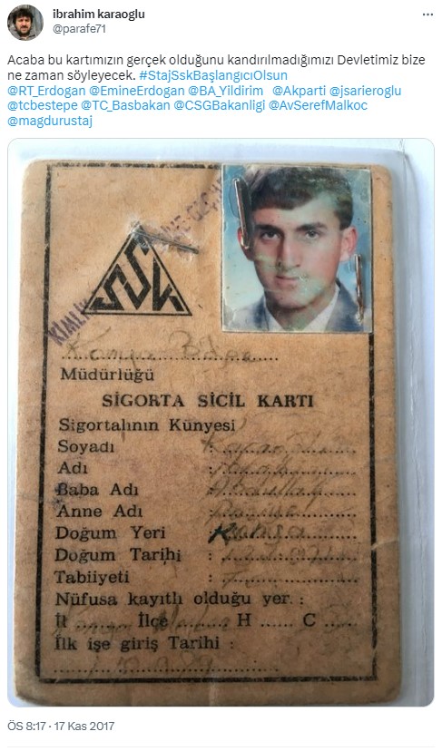 Görsel aramamız sonuucnda İbrahim Karaoğlu isimli bir kişinin 2017’de paylaştığı Tweet’e ulaşıyoruz. Tweet’teki kart, ‘SSK özürlü kartı’ değil, SSK sigorta sicil kartı. Bunun yanı sıra karttaki fotoğraf ve bilgilerin de değiştirildiğini görüyoruz. Kartın orijinal halinde İbrahim Karaoğlu’nun fotoğrafı ve kişisel bilgileri yer alıyor.