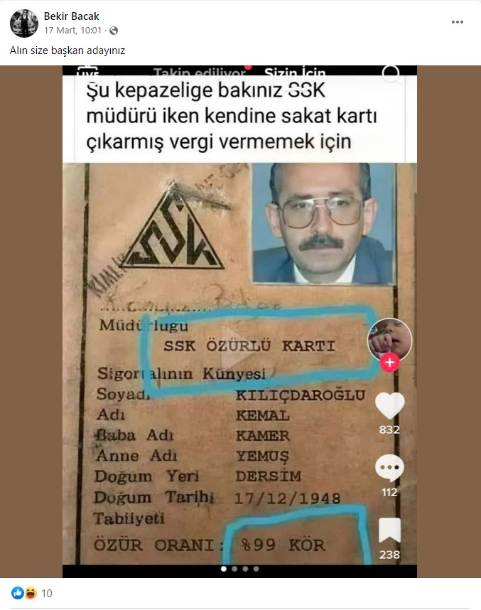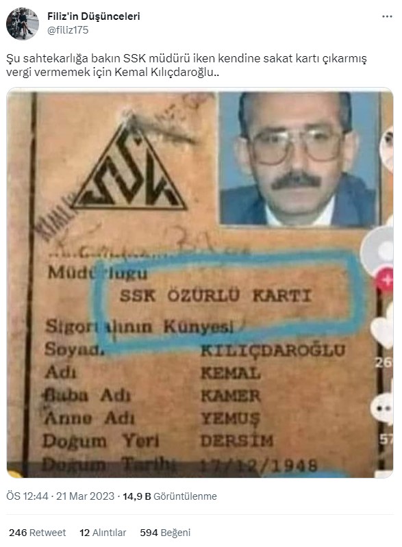 Söz konusu paylaşımda, sözde bir ‘SSK özürlü kartının’ Kemal Kılıçdaroğlu’na ait olduğu iddia edildi.