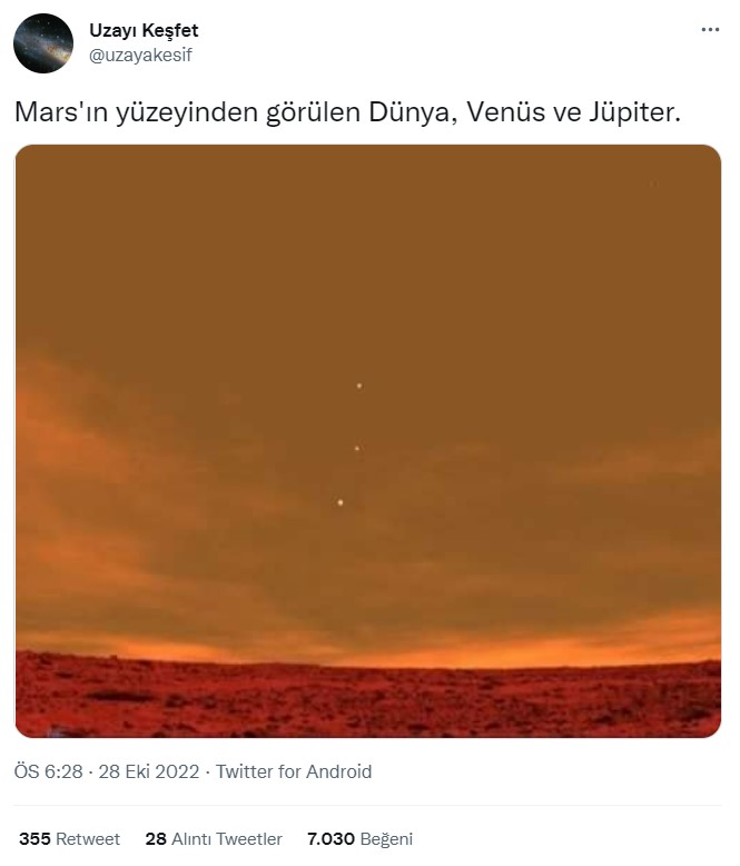 Mars yüzeyinden bakıldığında Dünya, Venüs ve Jüpiter’in belli bir sırada göründüğü iddia edilen bu fotoğrafın gerçek olmadığı bazı Twitter kullanıcıları tarafından da ifade edilmiş. İddiaya konu olan bu görseli inceledik.