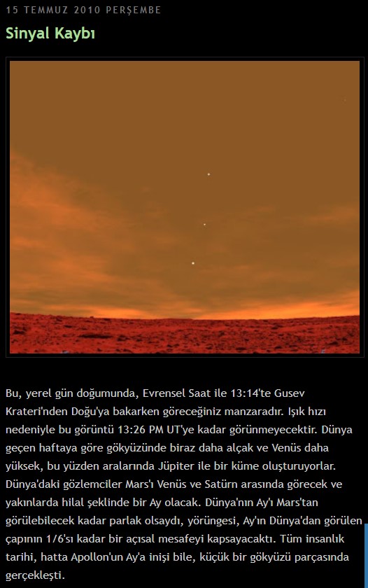 Mars’ın yüzeyinden Dünya, Venüs ve Jüpiter’in kaydedildiği anı gösteren bu fotoğrafı anahtar kelimelerle Google’da taradığımızda herhangi bir sonuca ulaşamamıştık. Fotoğrafı TinEye ile tersine görsel arama yöntemi ile aradığımızda, görüntünün 2010 yılından bu yana paylaşımda olduğunu görüyoruz. Louise Riofrio’ya ait olduğu görülen bir blog sitesinde, bu görsel ile alakalı olarak “Eğer 13:14’te Mars yüzeyinde duruyor olsaydınız göreceğiniz manzara bu olurdu” açıklamasını yapmış.