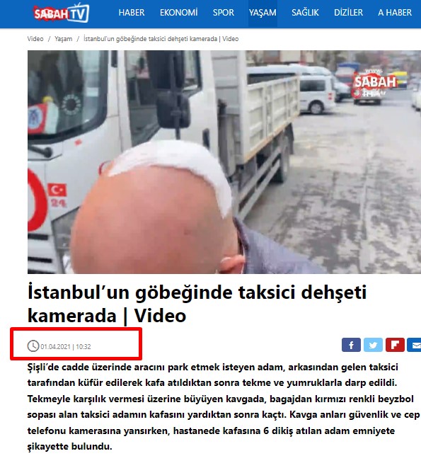 Edirne’de yaşanan bir olayı gösterdiği söylenen fotoğrafı Google’da tersine görselle araştırdığımızda 1 Nisan 2021‘in haberleriyle karşılaşıyoruz. Sabah’ın haberinde yer alan bilgilendirmede, Şişli’de taksici ve aracını park etmek isteyen bir kişinin arasında yaşanan kavgayı gösterdiğini anlıyoruz. Böylece fotoğrafın, trafikte kavga çıkması sonucunda kafasına darbe alan Sinan Karabay’ın, olayın detaylarını gazetecilere anlattığı röportaj videosundan bir kesit olduğunu öğrenmiş olduk.