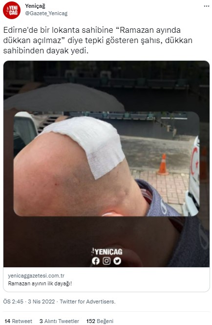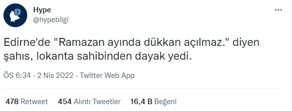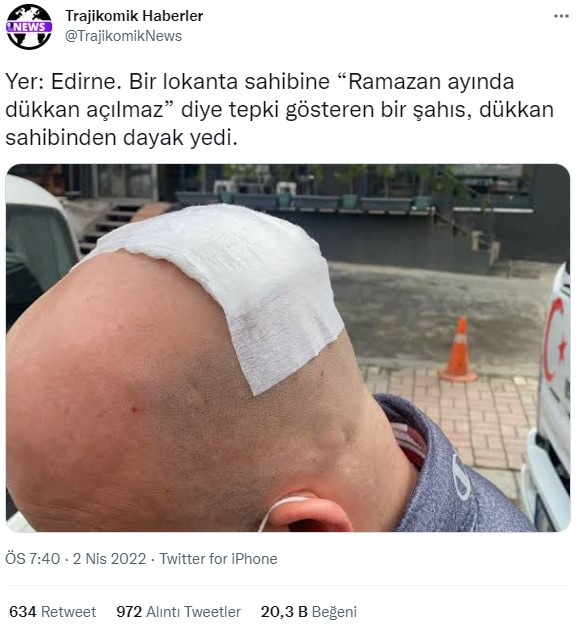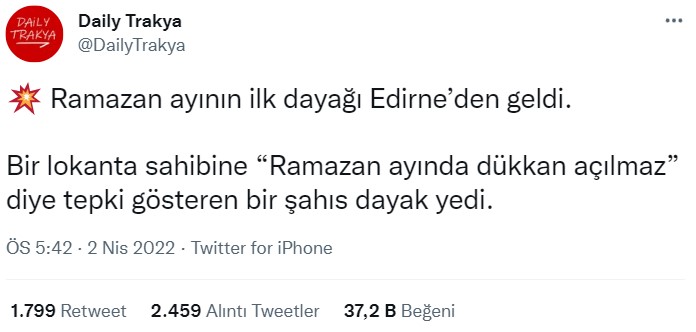 2 Nisan’dan bu yana sosyal medyada rastladığımız bir fotoğrafta, Edirne’de “Ramazan ayında dükkan açılmaz” diyen bir kişinin dükkan sahibinden darp edildiği söyleniyor. Bu tepki karşısında dükkan sahibinin kişiyi dövdüğü iddia ediliyor. Haber sitelerinde de bu konuya değinildiğini görüyoruz. İlk olarak Daily Trakya isimli twitter hesabından paylaşılmaya başlandığı görülen haberde detaylı bir kaynak belirtilmediğini söyleyebiliriz. Sosyal medya kullanıcıları arasında fazlaca etkileşim alan ilgili konunun Ekşi Sözlük’te de başlığını görmek mümkün.