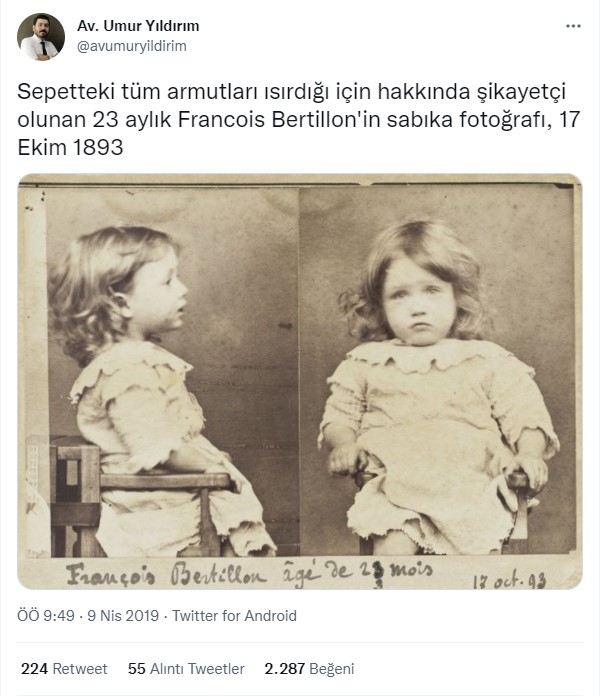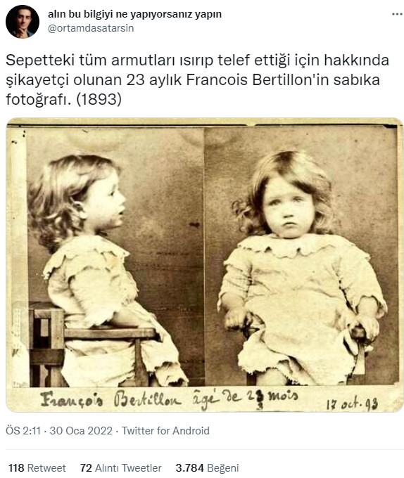 Gündeme gelen paylaşımdaki fotoğrafın altında “Sepetteki tüm armutları ısırıp telef ettiği için hakkında şikayetçi olunan 23 aylık Francois Bertillon’in sabıka fotoğrafı. (1893)” şeklinde bir yazıyı görüyoruz.