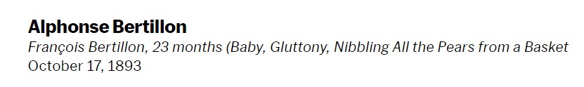 Fotoğrafın altında yer alan yazının çevirisinde, “François Bertillon, 23 ay (Bebek, Oburluk, Bir Sepetten Bütün Armutları Kemirmek) 17 Ekim 1893” açıklaması yer almaktadır. Alphonse Bertillon‘u arama motorlarında aradığımızda, Francois Bertillon’ın babası olduğunu anlıyoruz. Alphonse Bertillon’a dair araştırmamızın devamında ise sabıka fotoğraflarının mucidi ve suçluların kayıt, kimlik tespiti için fotoğraf çekiminin kullanılması fikrini ortaya atan kişi olduğunu gördük. Dolayısıyla oğlunun gündem olan fotoğrafını sadece hatıra ve deneme amacıyla çektiğini anlamış olduk. Fotoğrafçı olmasının yanında polis memuru ve araştırmacı da olan Bertillon, biyometrik fotoğraf çalışmalarıyla da öne çıkan bir kişilik olmuştur. Alphonse Bertillon’ın bebeklere ait yaptığı ilk deneme bu değildir. Sabıka fotoğrafı koleksiyonu ve çeşitli çalışmaları mevcut.